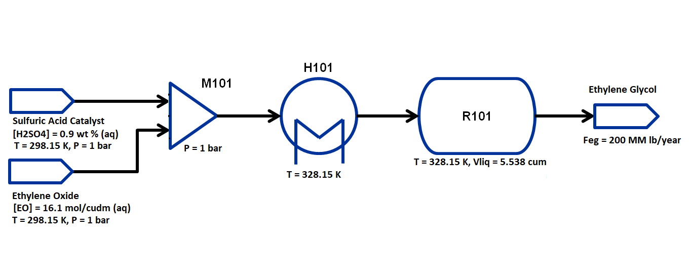 The flowsheet that we will be using for this module is shown below with the stream conditions. We will be processing ethylene oxide and catalyst solutions of fixed concentrations to produce 200 MM lb/year of EG. As shown in the flowsheet, the process consists of a mixer M101 for the two inlet streams, a heater H101 to preheat the feed to the reaction temperature, and a CSTR unit R101 with an external cooling system to remove heat generated by the exothermic reaction. We will assume ideal solutions and thermodynamics for this flowsheet, as well as well-mixed liquid behavior (no vapor phase) in the reactor. The properties required for this module are available in the same directory: