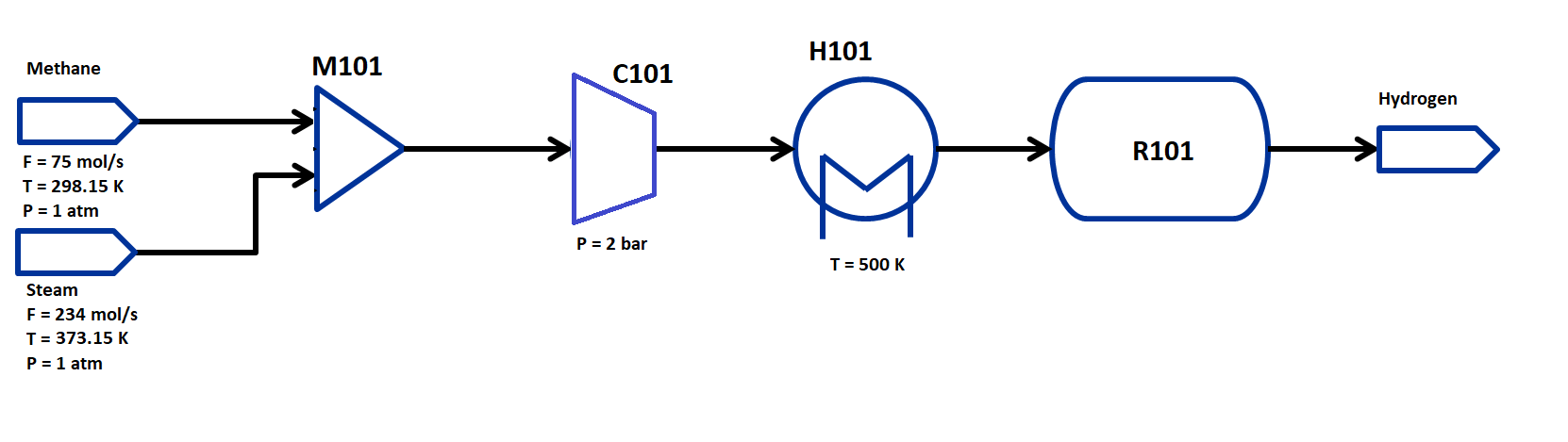 The flowsheet that we will be using for this module is shown below with the stream conditions. As in the prior example, we will be processing natural gas and steam feeds of fixed composition to produce hydrogen. The process consists of a mixer M101 for the two inlet streams, a compressor to compress the feed to the reaction pressure, a heater H101 to heat the feed to the reaction temperature, and a GibbsReactor unit R101. We will use thermophysical properties following the Peng-Robinsion cubic equation of state for this flowsheet.